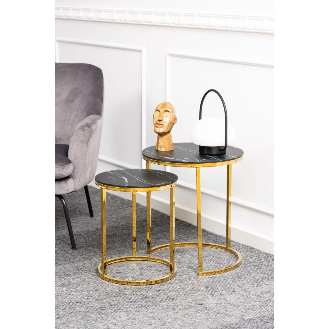 Points forts Toilinux Lot de 2 Tables d’appoint ronde en Marbre et Métal – Diam.45cm + Diam.35cm – Doré et Noir