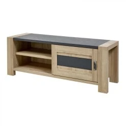 Ce grand meuble audio/vidéo à la proportion parfaite propose une finition Chêne blond au veinage plus vrai que nature mise en contraste par un revêtement façon céramique très probant.