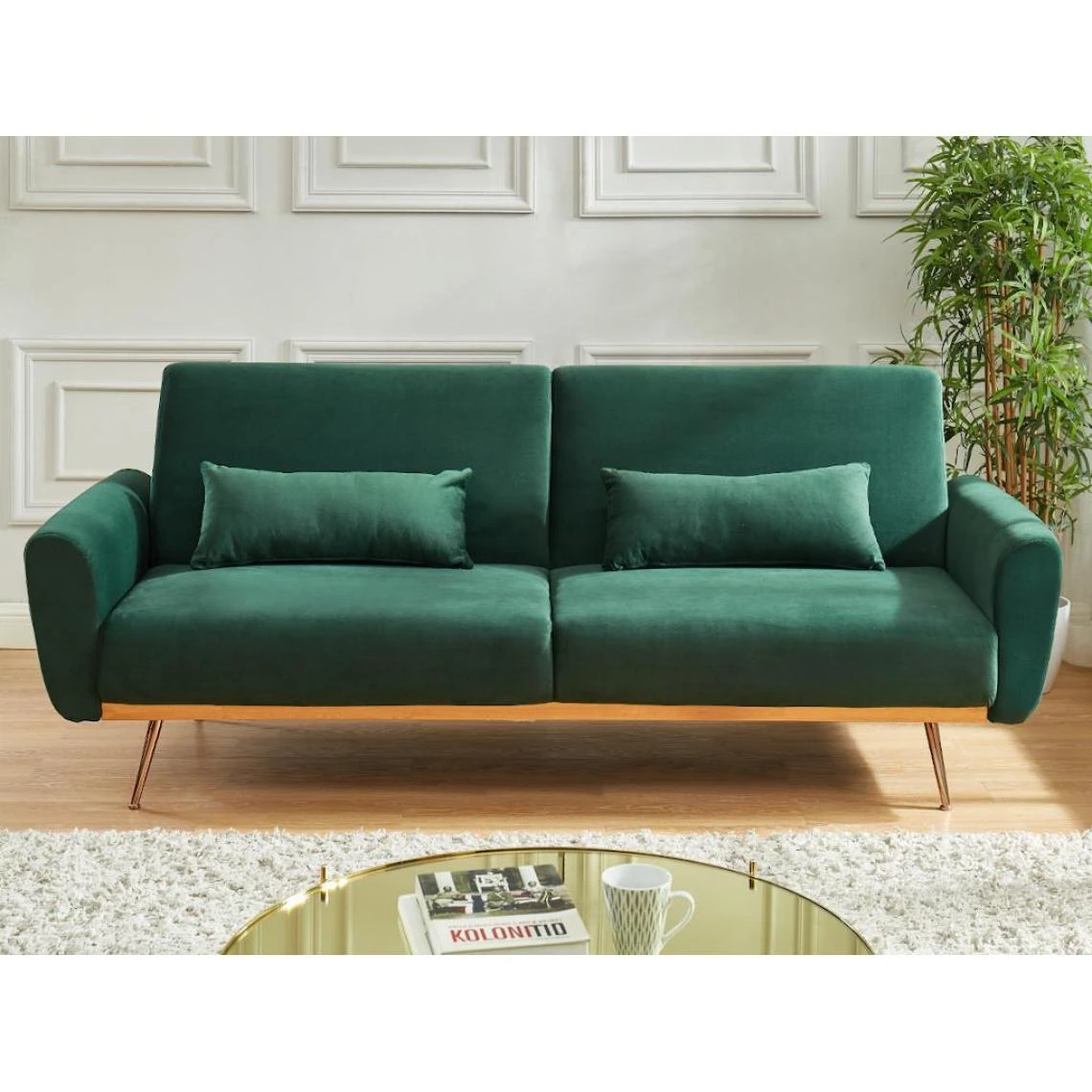 Points forts Vente-Unique Ensemble canapé 3 places convertible clic-clac vert sapin LAUNEI et tapis taupe DOLCE